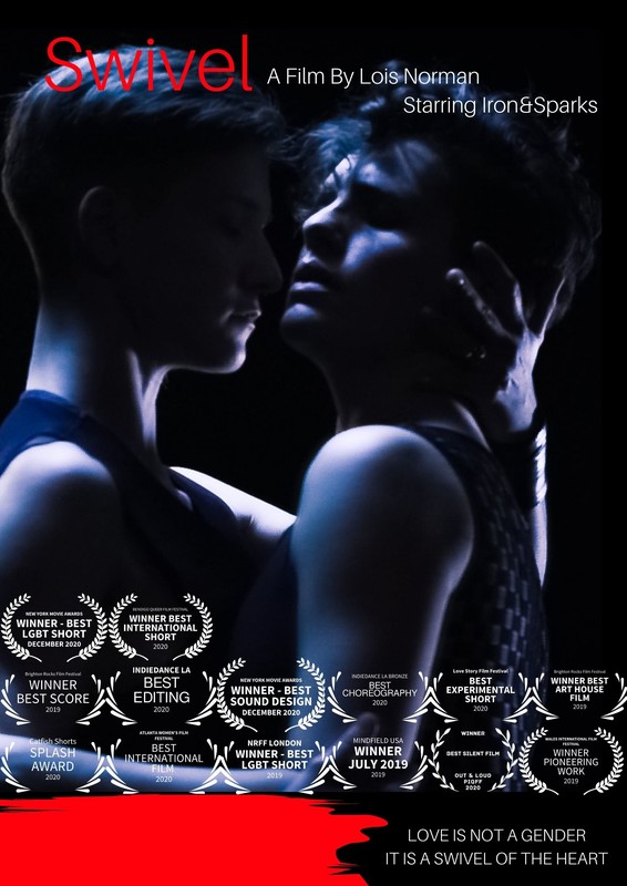 Swivel is a short gender fluid dance story by Award winning director Lois Norman, starring the trailblazing Iron&Sparks. With visceral Cinematography by Canadian Teryl Brouillette, powerful Sound Design by UK’s Jemma Cholawo and New Zealand’s Helen Mountfort moving cello score, Swivel is a brave leap of faith, that moves to express the courage it takes, to explore sexuality and self with true equality, acceptance and compassion.
